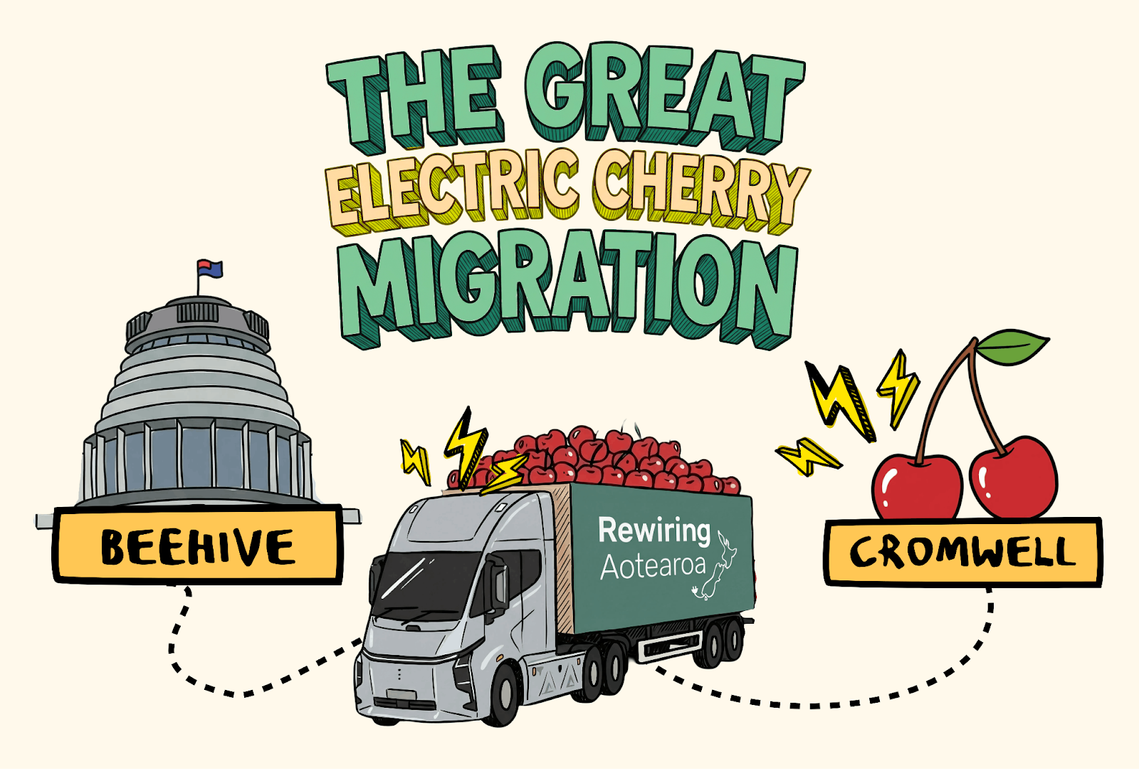 ‘The Great Electric Cherry Migration’ is sending 100% Electric Cherries via a 100% electric truck to 100% of our Members of Parliament. Rewiring Aotearoa’s Mike Casey, Etrucks’ Ross Linton and the Deepway electric truck will be on Parliament grounds on Tuesday February 10th from 11am - 2pm.