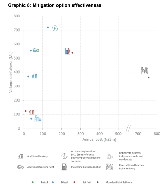 Electrification of transport reduces our reliance on oil and an MBIE report on fuel security compared different options based on cost and effectiveness. It showed that accelerating the transition towards electrification outlined by the Climate Change Commission was the best bet and was twice as useful and five times cheaper than restarting Marsden Point.